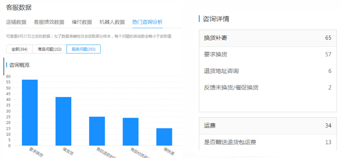 通过热门咨询分析可以了解到买家对什么比较感兴趣。比如:买家咨询的都是关于版型/效果的问题,那就可以考虑在标题/主图/详情页里对商品进行优化。