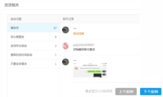 第四步:点击柱状图或咨询详情区跳转至详情浮层,商家可以在此查看问题具体的聊天场景,帮助理解。每个问题多有1000个案例,可以点击【上个案例】、【下个案例】切换查看哦~