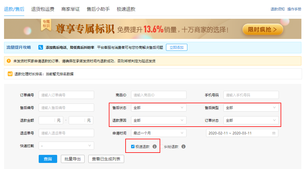 ①商家可以在【退款/售后】,筛选处选择【极速退款】即可查询。