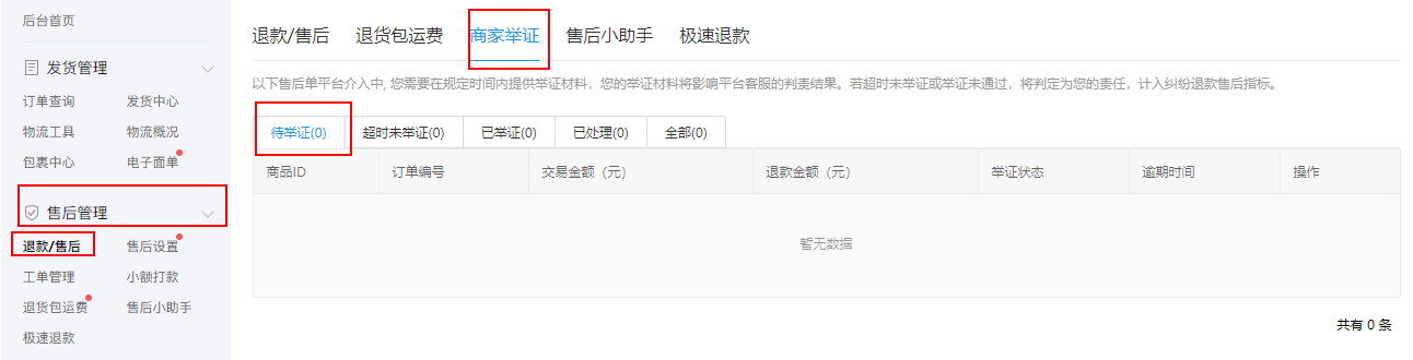商家可以在①网页版商家管理后台-【售后管理】-【退款/售后】-【商家举证】处,或者在商家手机APP-【退款】-【售后】,找到【商家举证模块】查看待举证订单。