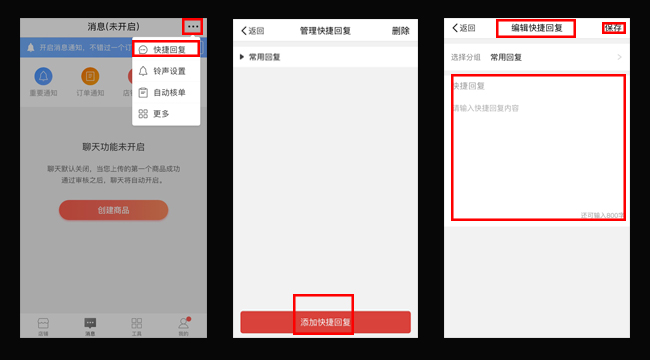 ②管理快捷回复。点击【消息】旁边的三个小点进入【快捷回复】,添加快捷回复,完成后点击保存。