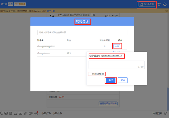 ①会话转移,可以将正在聊天的用户转移给其他客服。
