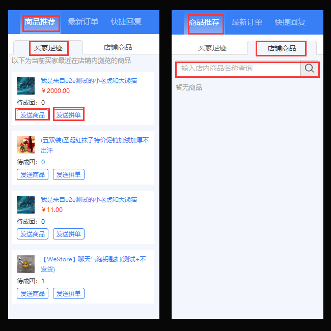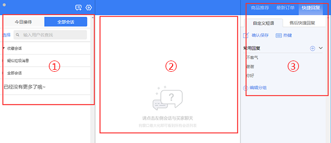 (3)右边栏:包含商品推荐、新订单和快捷回复
