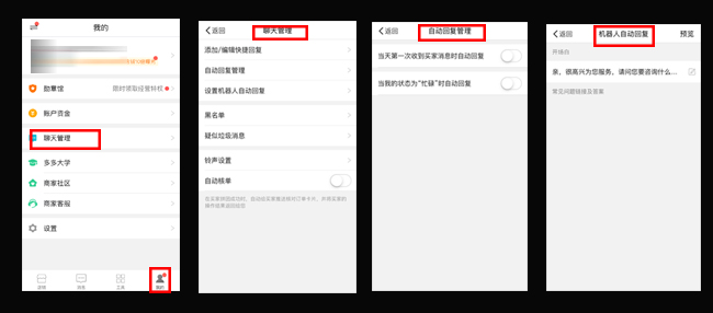 ④在【我的】-【聊天管理】页面中可以设置自动回复管理和机器人自动回复。