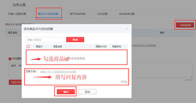 第二步:点击【添加回复】,勾选商品ID,输入回复内容,点击确认。