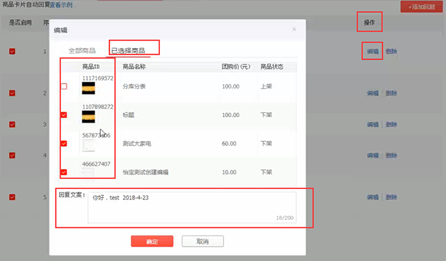 第四步:针对已经设置好的商品卡片自动回复可以进行修改,点击编辑,修改商品id和回复文案。