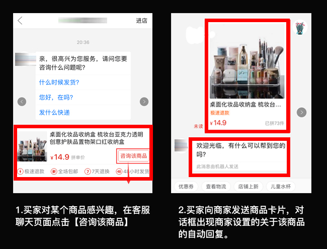 ①商品卡片自动回复的消息是计算商家有效回复,有利于提高五分钟回复率。